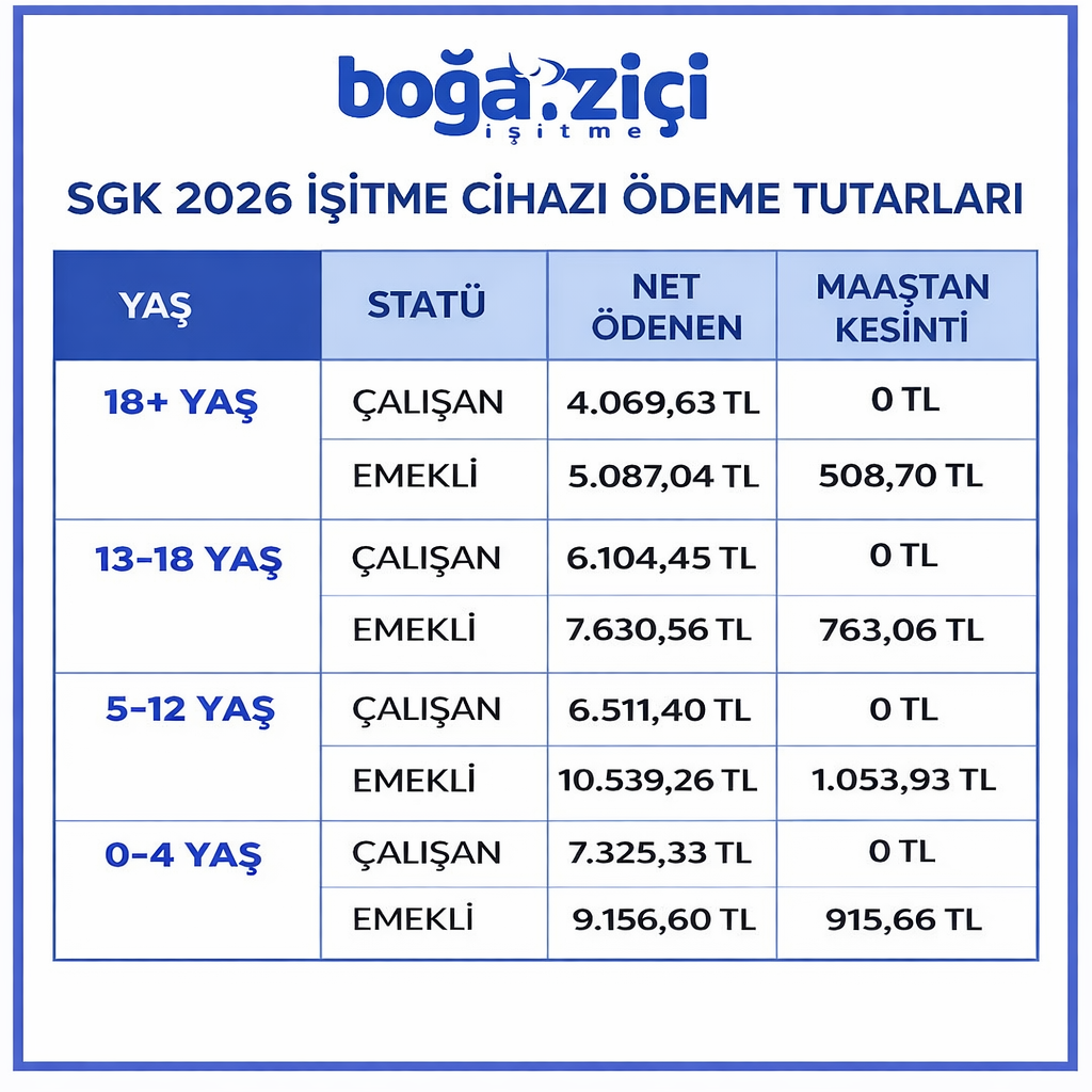 2024-2025 işitme cihazlarında SGK (Sosyal Güvenlik Kurumu) ödemesi 11 Ağustos 2024 tarihli değişiklikle yetişkinler için çalışanlarda 3391,36 TL, emeklilerde 4239,20 TL’ dir. SGK, çift işitme cihazı için raporda belirtildiği takdirde ödeme yapmaktadır. Bu ödeme işitme merkezlerine yapılmaktadır.